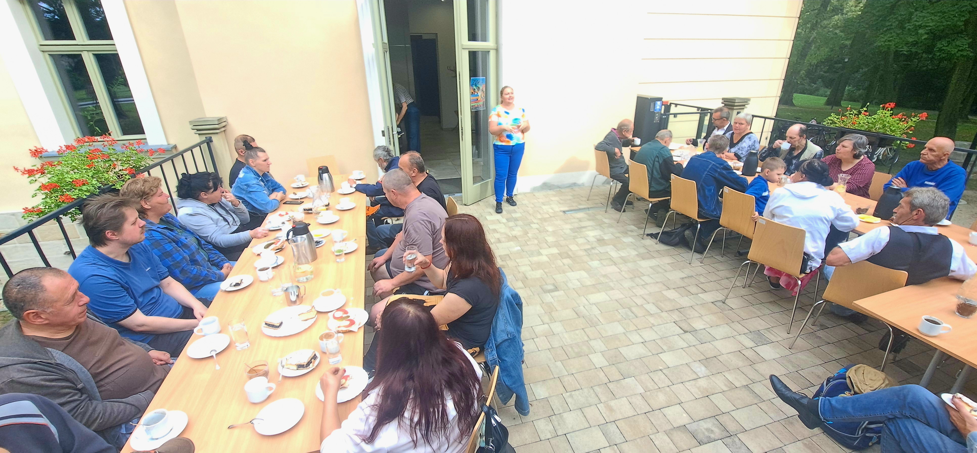 Następnie zostali zaproszeni na „królewskie śniadanie na tarasie”, w otoczeniu zieleni i historycznego klimatu. Uczestnicy mogli delektować się bogato zastawionym stołem: aromatyczną kawą, herbatą, świeżym kołaczem, pajdą chleba ze swojskim smalcem i innymi smakołykami. Była to idealna okazja, aby w niecodziennej atmosferze spędzić wspólnie czas, porozmawiać i wzmocnić więzi.